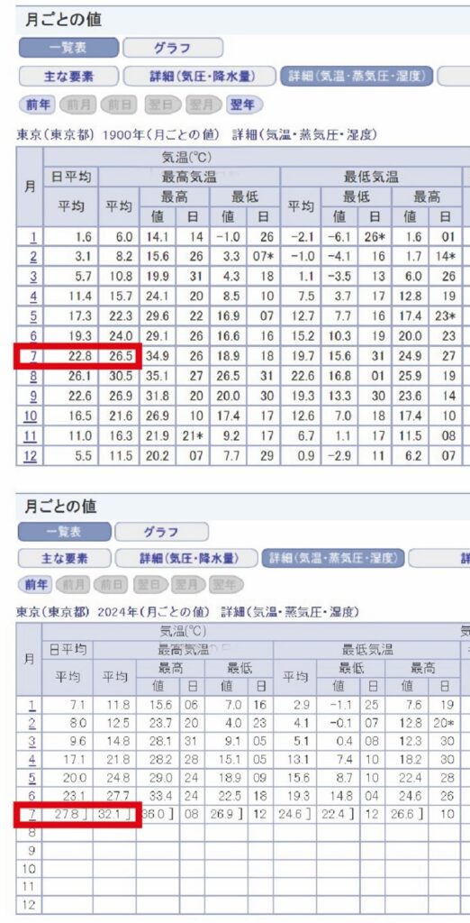 遡ること1900年・・・7月の平均気温は26.5度。2024年(7/16現在)32.1度!!